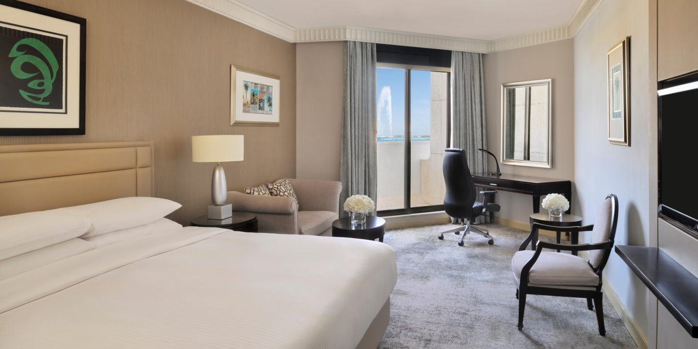 Le camere e le suite di InterContinental Jeddah sono pensate per offrire comfort e viste panoramiche su Mar Rosso, Fontana di Re Fahd o skyline urbano, con dotazioni moderne come connessione internet ad alta velocità, televisore a schermo piatto, aria condizionata. Le Classic Rooms costituiscono la tipologia di base, con vista sul mare o sulla città; le Premium Rooms offrono spazi leggermente più ampi rispetto alle Classic e, in alcuni casi, una prospettiva più aperta sul paesaggio urbano o costiero. Tra le suite, la Junior Suite presenta metrature superiori, per chi desidera un soggiorno più spazioso, mentre le One Bedroom Suite, con superficie variabile, sono pensate per chi cerca ambienti più articolati e servizi dedicati. La Royal Suite rappresenta la soluzione di punta in termini di dimensione e disposizione interna, con metrature molto generose e spazi distinti per soggiorno, camera da letto e aree di rappresentanza.