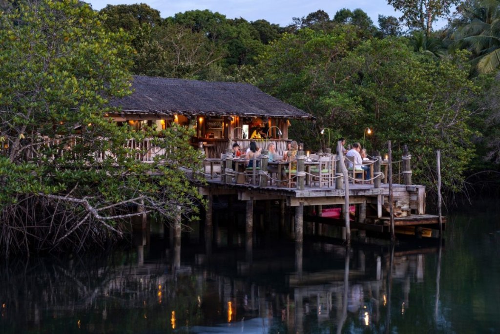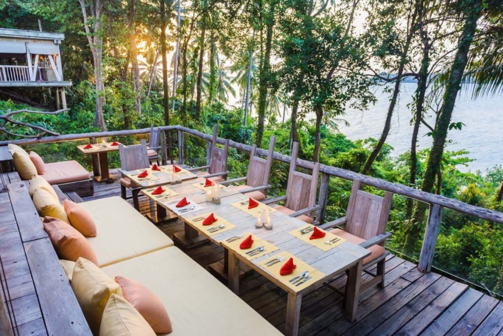I ristoranti e i bar del Soneva Kiri garantiscono un’esperienza gastronomica indimenticabile. Ambientazioni uniche ed incredibili dove gustare piatti della cucina internazionale e della più antica tradizione tailandese realizzati con prodotti freschi e in molti casi provenienti dall’orto dell’hotel… questo è quanto offrono i ristoranti del resort. Per iniziare al meglio la giornata Il Treepod Dining, uno dei punti forti del resort, accoglie i suoi ospiti in nidi di bambù sistemati su alberi a sei metri di altezza raggiunti da camerieri acrobati che con maestria si destreggiano tra piatti e rami per proporre menù gourmet. Dopo una breve crociera attraverso le mangrovie di Klong Ya iKee, si raggiunge una elegante rifugio sospeso sull’acqua, il Benz’s, dove scoprire tutti i segreti della cucina thai nel cuore della giungla selvaggia; direttamente sulla spiaggia dorata, The Beach serve piatti freschi e semplici per pasti leggeri tra un tuffo e l’altro; The View, un moderno bistro sulla collina per ammirare l’infinità del mare. Il So Spiritual, sulla collina con una spettacolare vista panoramica e il So Spirited a bordo piscina, propongono drink, sorbetti, succhi e gelati per deliziare gli ospiti in ogni momento della giornata. Per momenti unici e indimenticabili sarà possibile organizzare pranzi, cene e simpatici pic-nic sulla spiaggia, immersi nella natura, nella propria villa e ovunque si desideri. Per una serata speciale, il Cinema Paradiso propone film classici e contemporanei da vedere su lettini sotto le stelle accompagnati da snack e cocktail creativi.